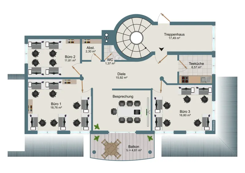Das schöne Büro liegt auf der Südseite eines repräsentativen Geschäftshauses in einem Mischgebiet. Es stehen Ihnen 3 abgeschlossene Räume, eine separate Teeküche mit kleiner Einbauküche sowie eine Abstellkammer zur Verfügung. Der Südbalkon lädt zur kleinen Kaffeepause ein. Die Räumlichkeiten sind mit hellem Laminatböden ausgestattet. Raumhohe Fenster und Türen sorgen für außergewöhnlich viel